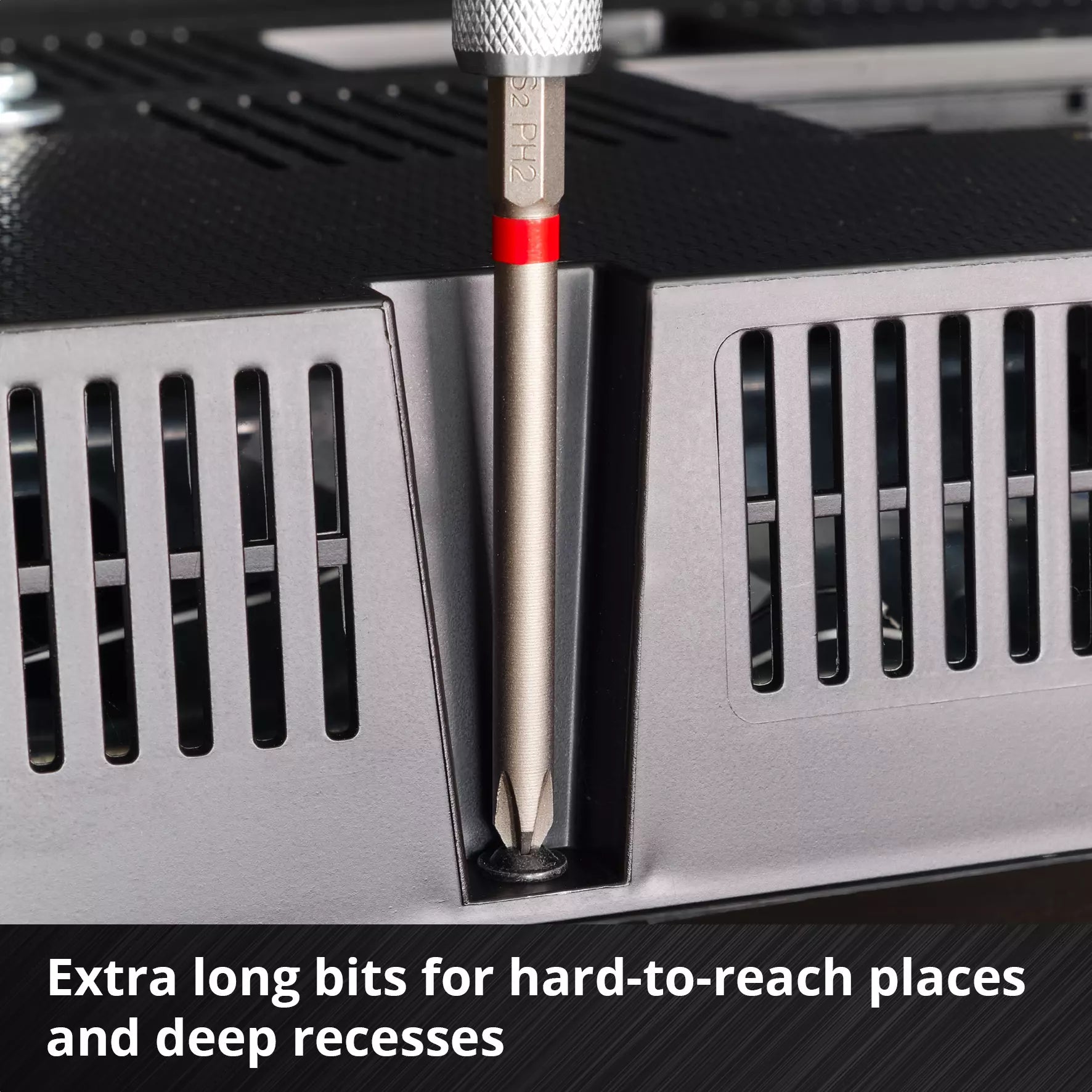 • Compatibilidad universal: El vástago E 6.3 de las puntas asegura su compatibilidad con todos los portabrocas y portapuntas estándar en destornilladores inalámbricos y taladros disponibles en el mercado.