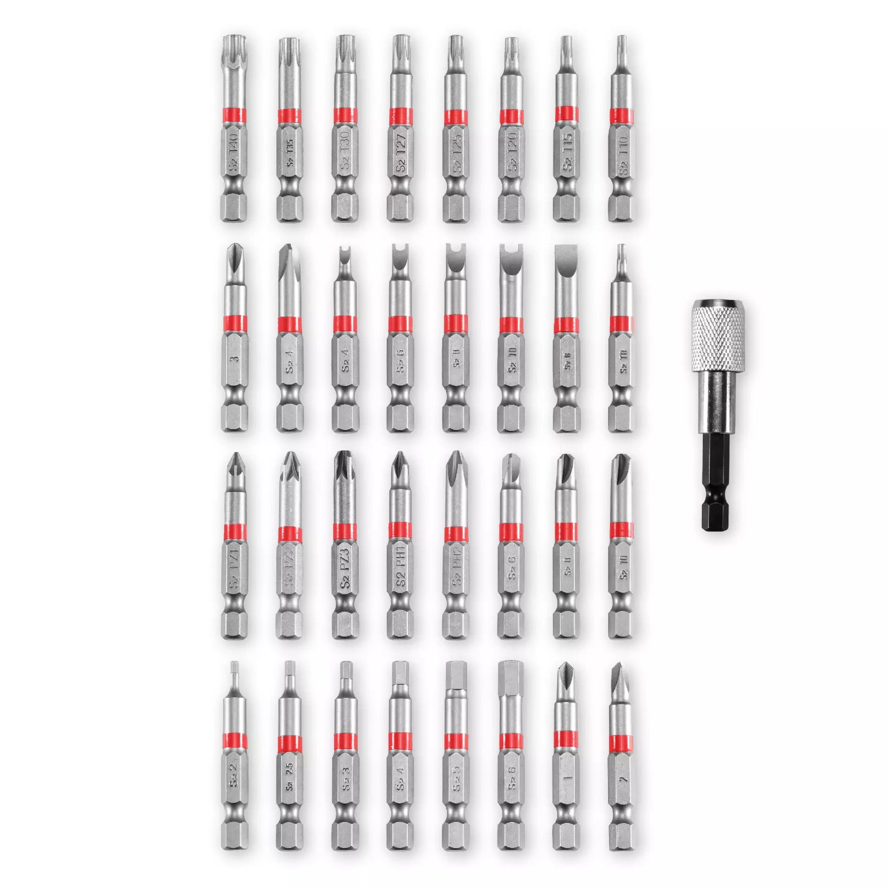 • 32 puntas de 50 mm de longitud, fabricadas en acero S2 robusto y arenado, con vástago E 6.3 y anillo de color rojo para fácil identificación.