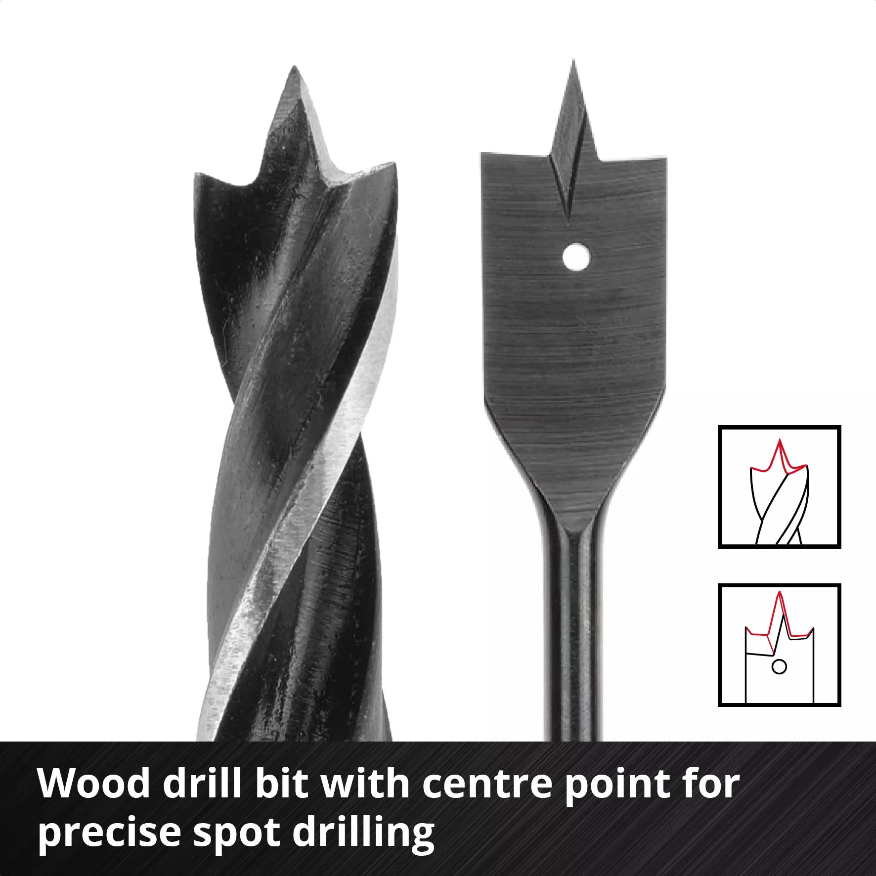 • 5 brocas planas en tamaños: 12 mm, 14 mm, 16 mm, 18 mm, 22 mm.
