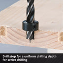 • 4 topes de profundidad para brocas en tamaños: 5 mm, 6 mm, 8 mm, 10 mm.