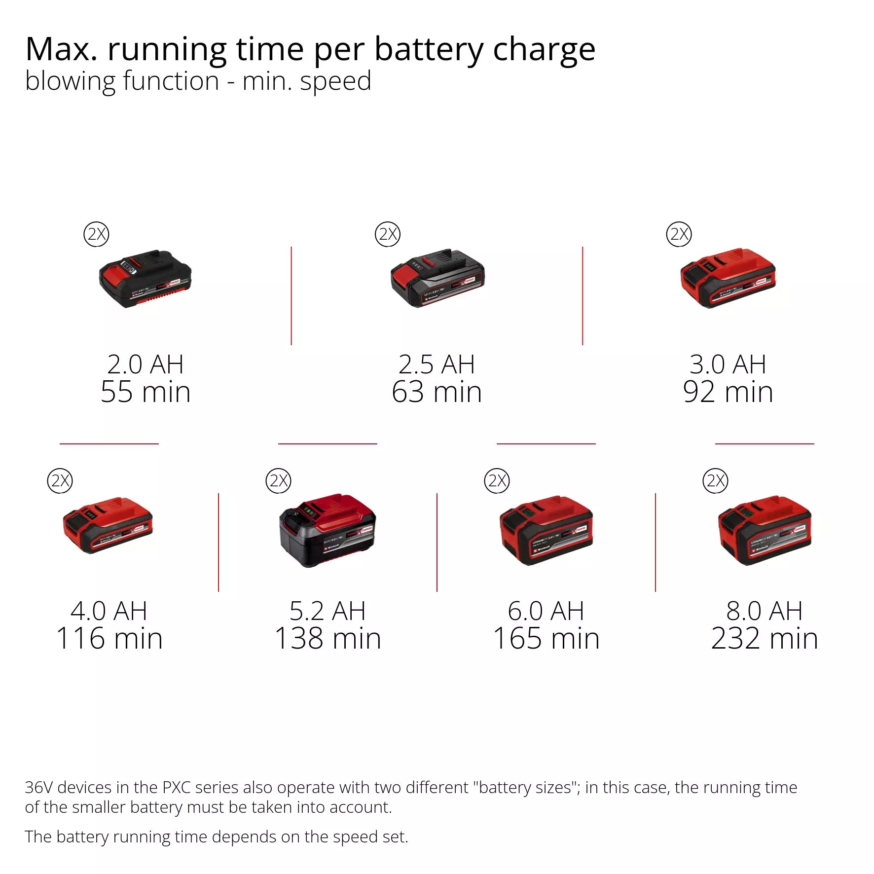 The Einhell GP‑LB 36/230 Li E BL‑Solo is a powerful cordless leaf blower with a 36 V brushless motor (two 18 V batteries, not included). It has an air speed of 230 km/h and a maximum flow rate of 890 m³/h , ideal for professional cordless garden work and with an ergonomic design.