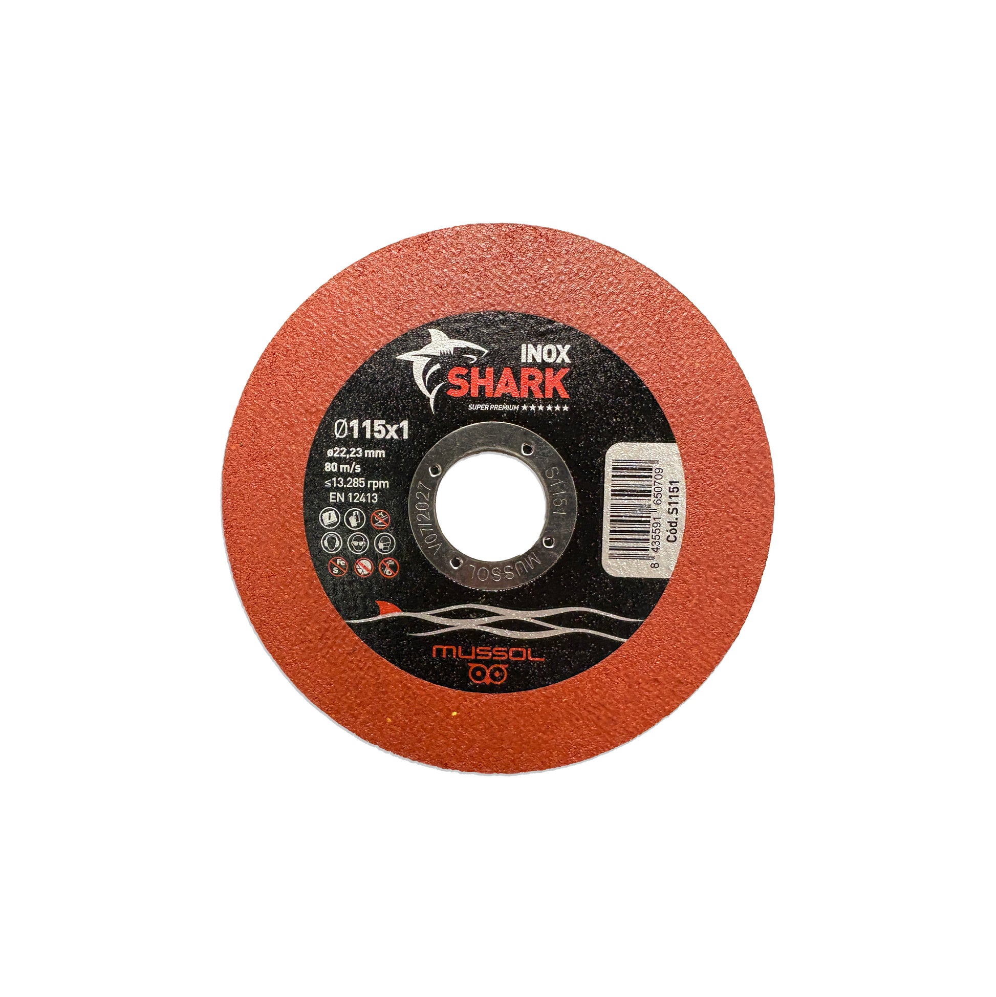 A cutting disc for stainless steel and general steel , free of iron, sulfur, and chlorine, designed to offer speed, a clean, extra-fine cut, and excellent lifespan in demanding environments. This is the "Shark" product within Mussol's Inox range.
