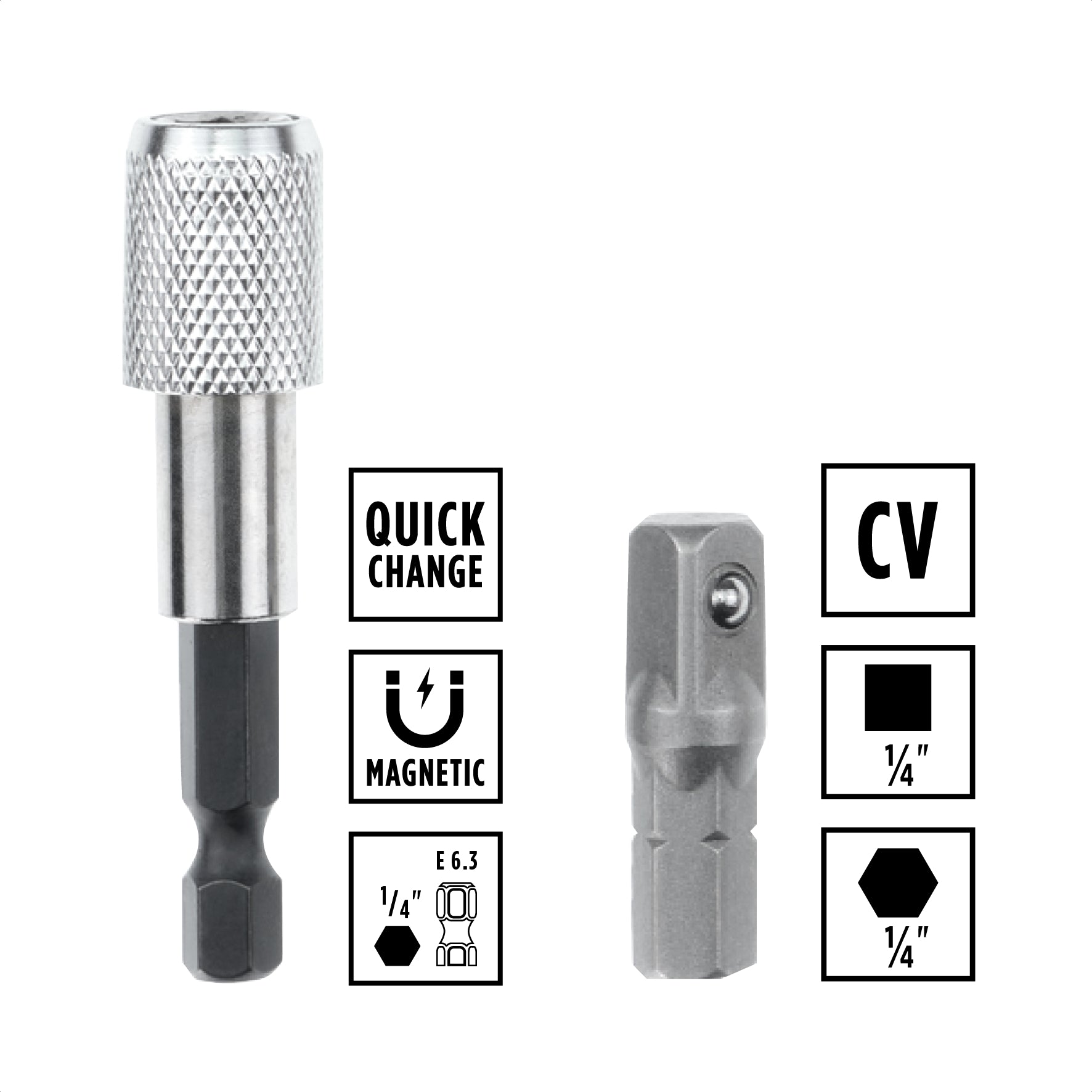 - 1 x 60mm quick-change bit holder with E 6.3 shank, made of durable carbon steel, allowing for quick and easy bit changes thanks to its powerful magnet.