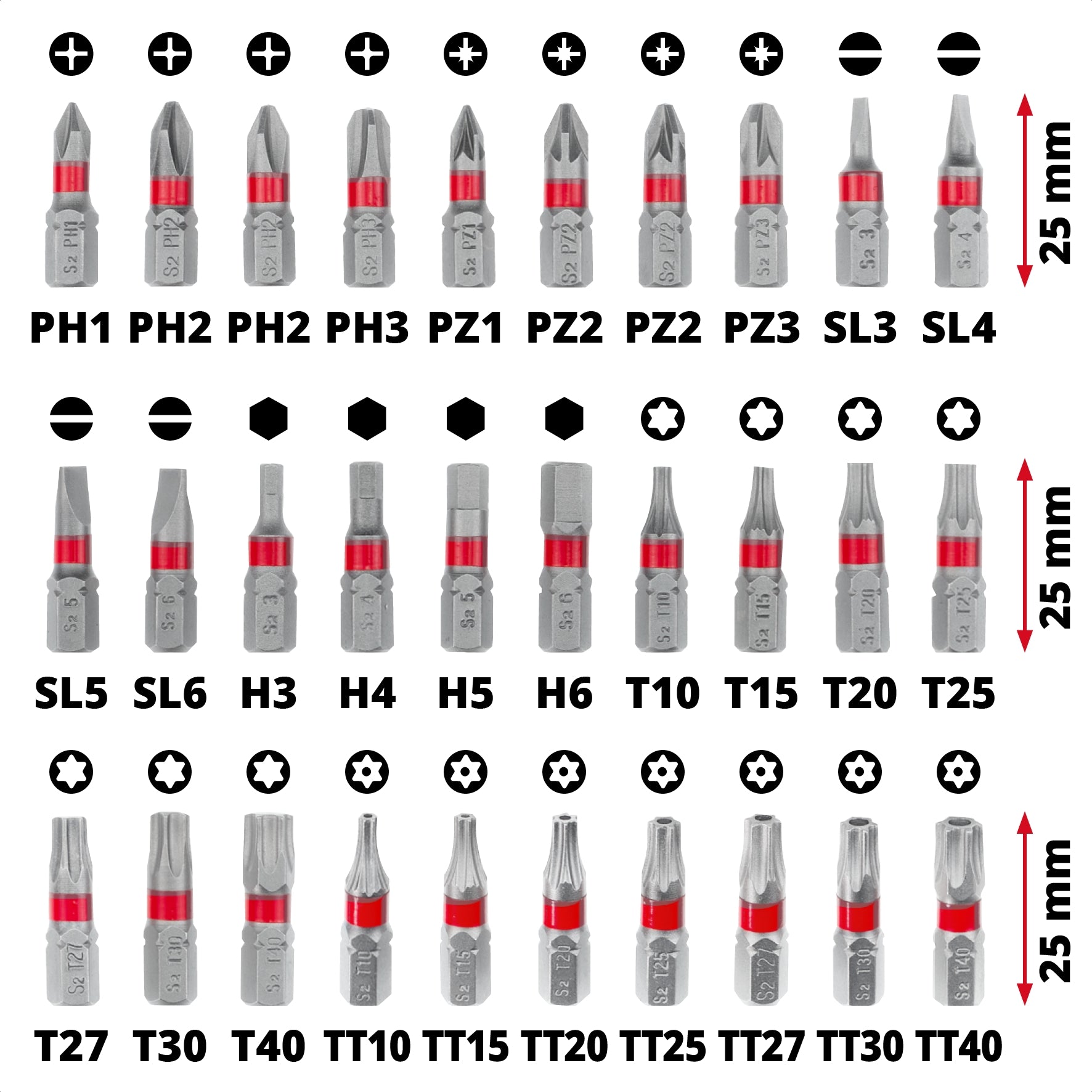 30 25 mm bits with C 6.3 shank, identified by a red ring for easy identification. The bits included are: